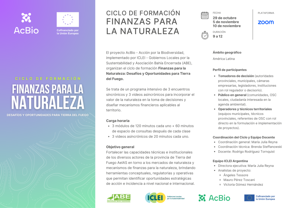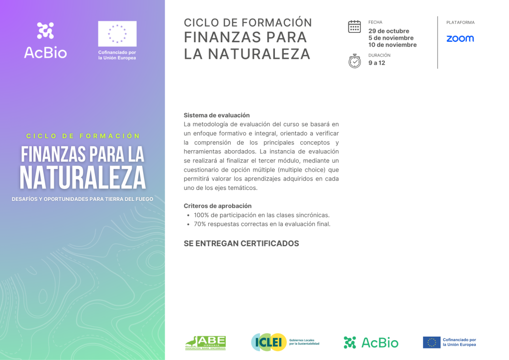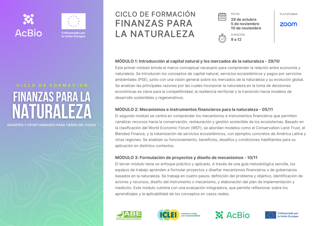 El Ciclo de Formación en Finanzas para la Naturaleza estará a cargo de Rodrigo Rodríguez Tornquist, de la Asociación Sustentar entar, y cuenta con el acompañamiento del Gobierno de la provincia de Tierra del Fuego AeIAS y de los Municipios de Río Grande, Tolhuin y Ushuaia.